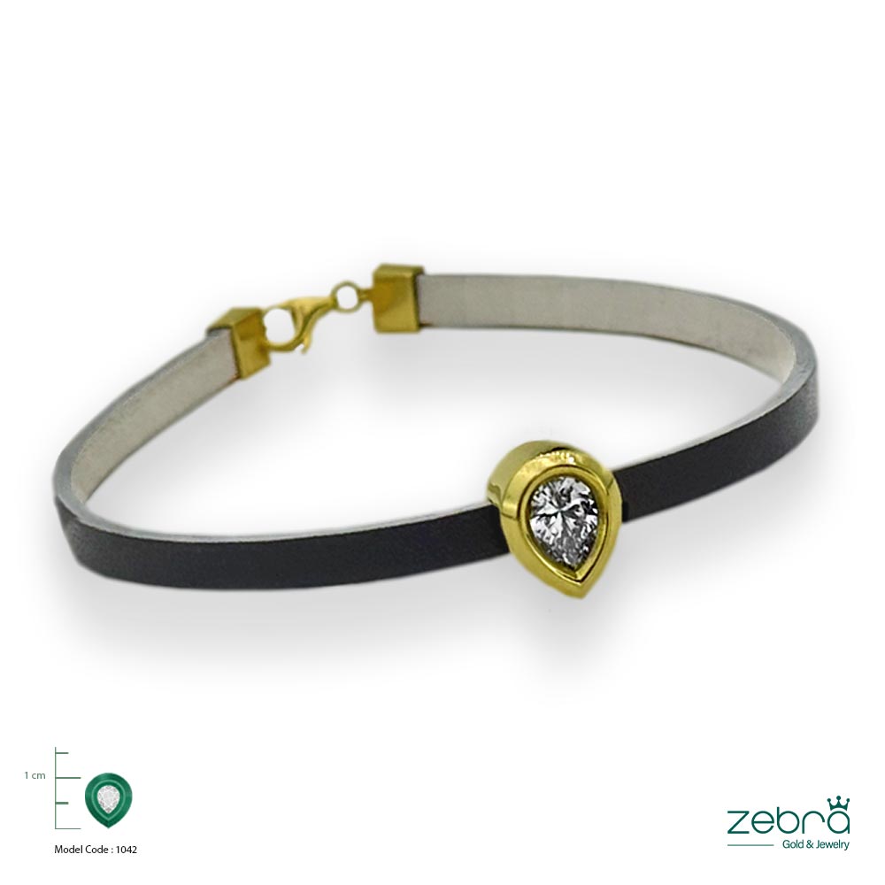 ZG-B-036 | دستبند طلا دخترانه با بند چرم طوسی و آویز اشک زیرکونیا