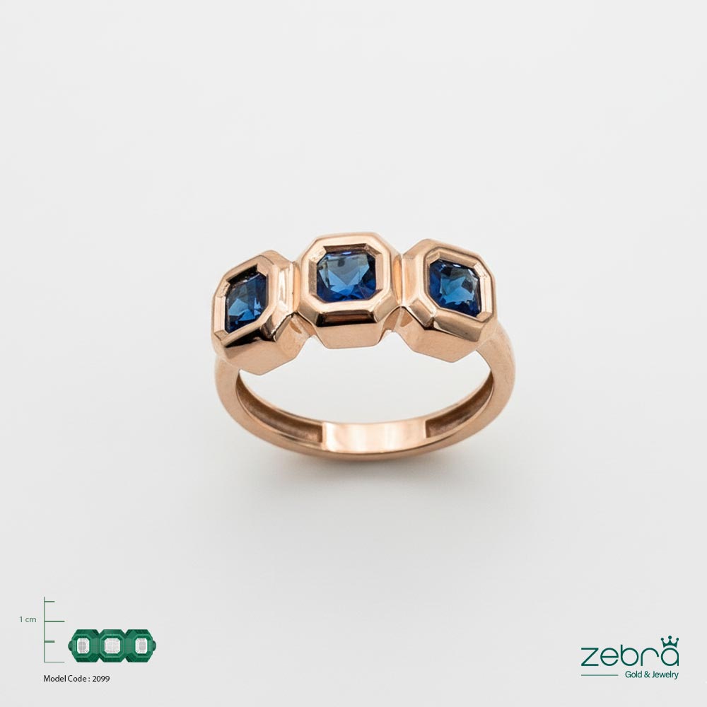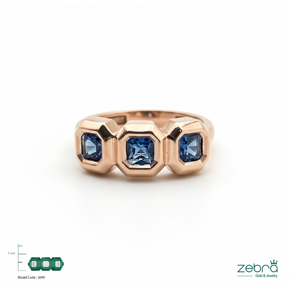 انگشتر طلا رزگلد سه سنگ یاقوتی زبرا گلد یک قطعهی خیرهکننده با طراحی کلاسیک و ابعاد چشمگیر است.