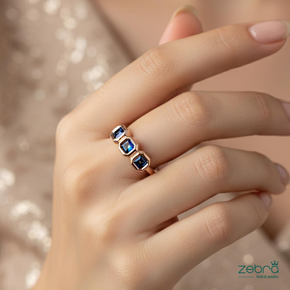 طراحی سهتایی و فاخر: سه سنگ مربع شکل با رنگ عمیق یاقوت کبود (آبی تیره)، به صورت درشت و متوالی در کنار هم قرار گرفتهاند. قاببندی شش ضلعی و طرح قابدار هر سنگ، نه تنها زیبایی آن را دوچندان میکند، بلکه مقاومت سنگها را نیز افزایش میدهد.