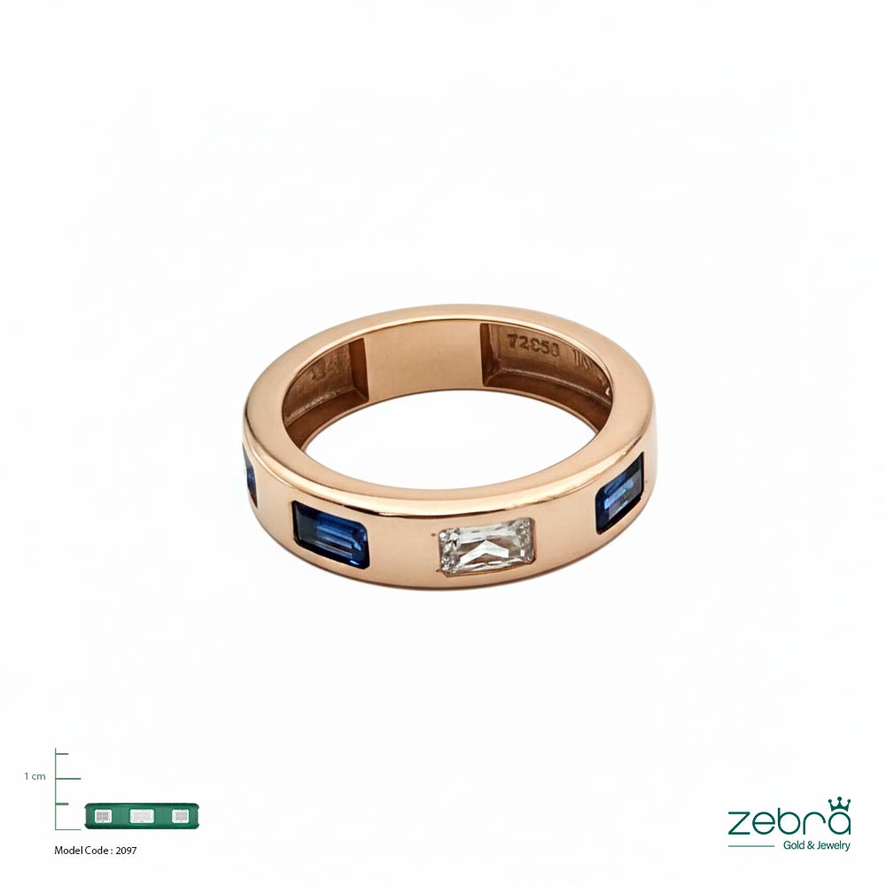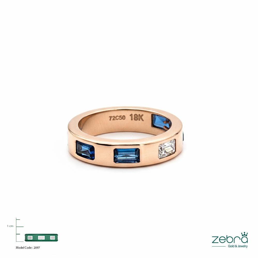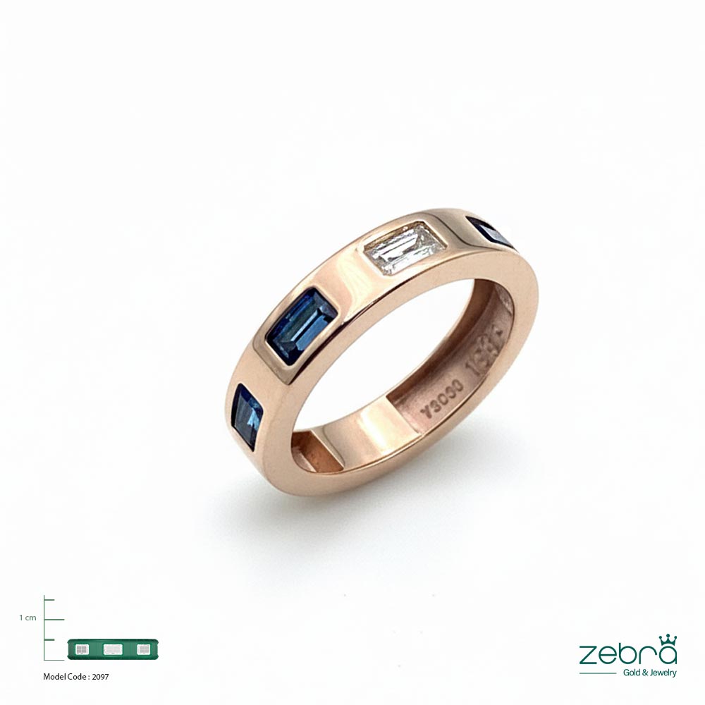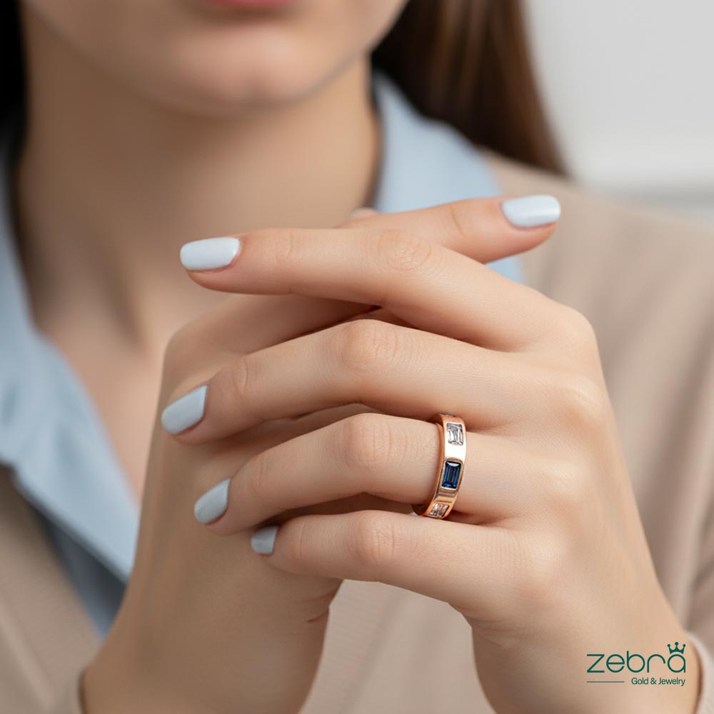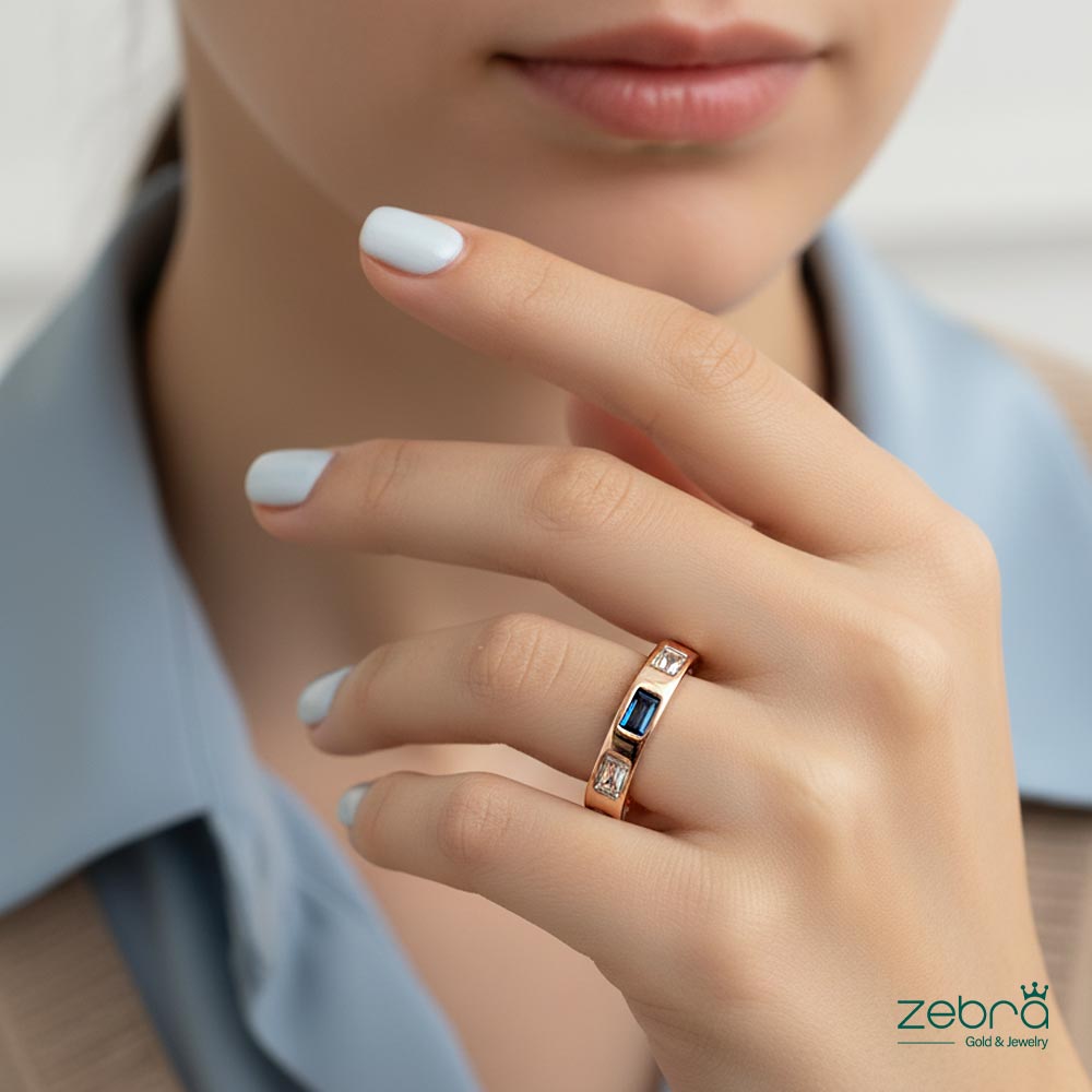 طلای رزگلد ۱۸ عیار: رنگ گرم و ملایم طلای ۱۸ عیار رزگلد، زیبایی سنگهای آبی را دوچندان میکند و تضمینکننده ارزش و کیفیت ماندگار این انگشتر طلا با سنگ باگت است.