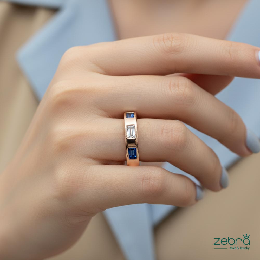 طراحی خاص باگت: تراش باگت، که برش مستطیلی و نواری شکل دارد، جلوهای مدرن و خطی به این انگشتر بخشیده است. استفاده از سنگهای آبی کبود در کنار سنگهای سفید، کنتراستی زیبا و چشمنواز ایجاد کرده است.