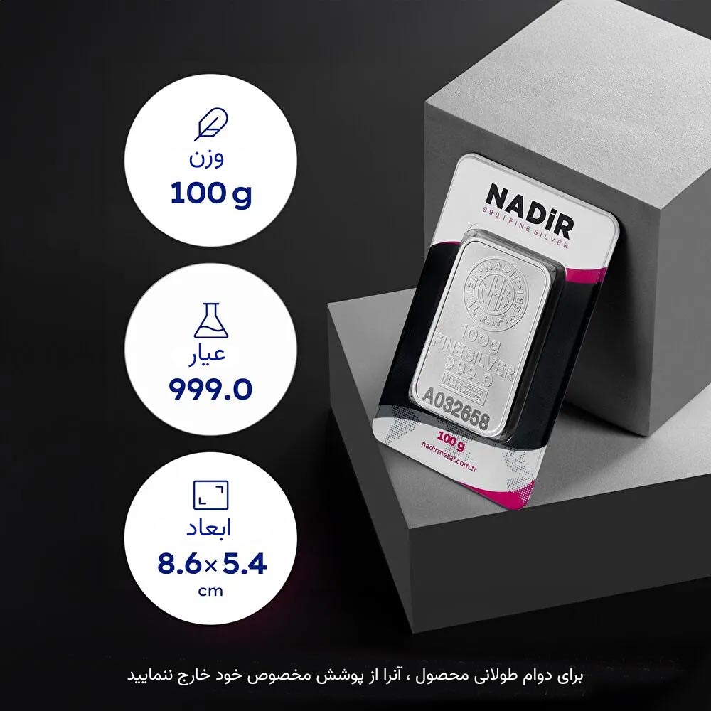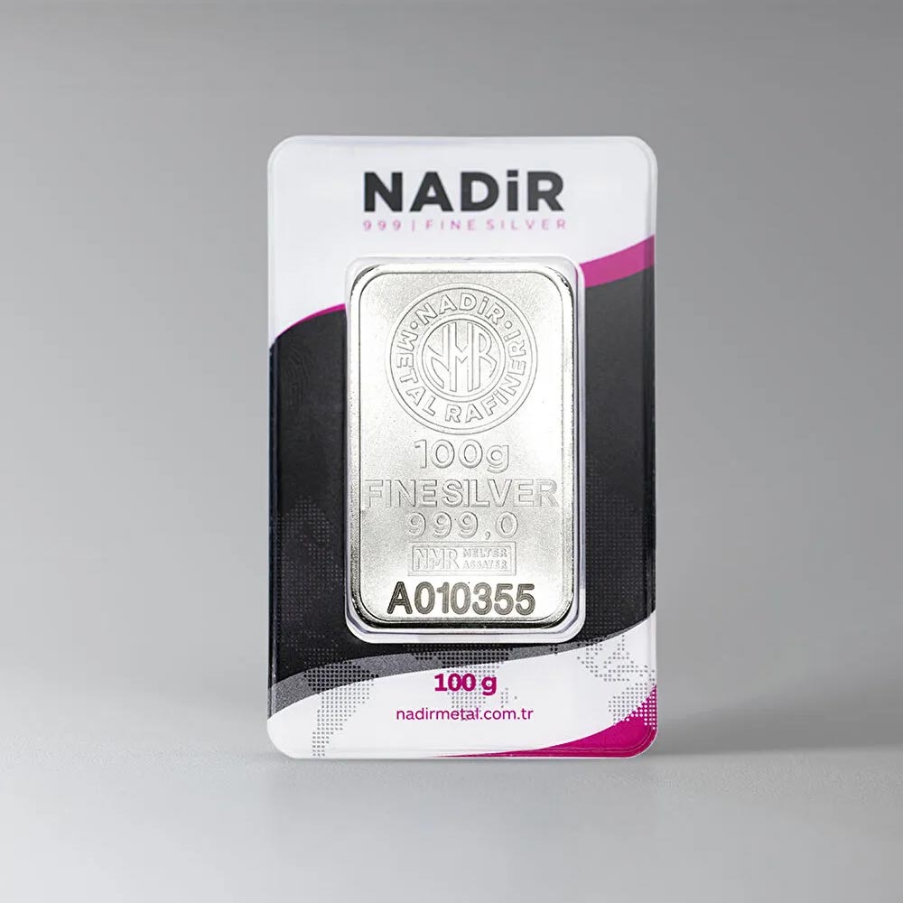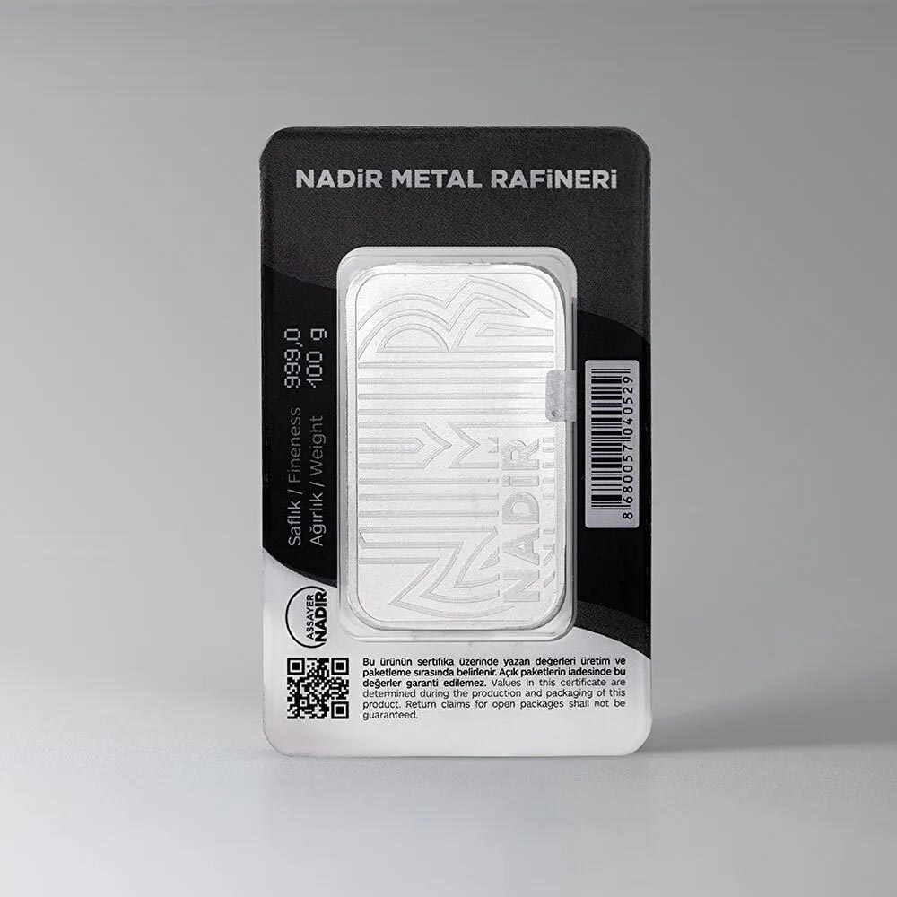 شمش نقره ۱۰۰ گرمی نادیر گلد یکی از محصولات پرطرفدار برند Nadir Metal Rafineri ترکیه است. این شمش با خلوص 999.9 (99.99%) تولید شده و در بستهبندی کارتی جدید و مدرن عرضه میشود.