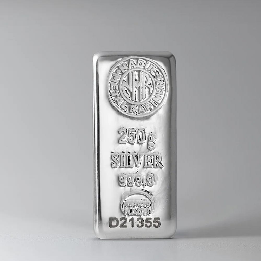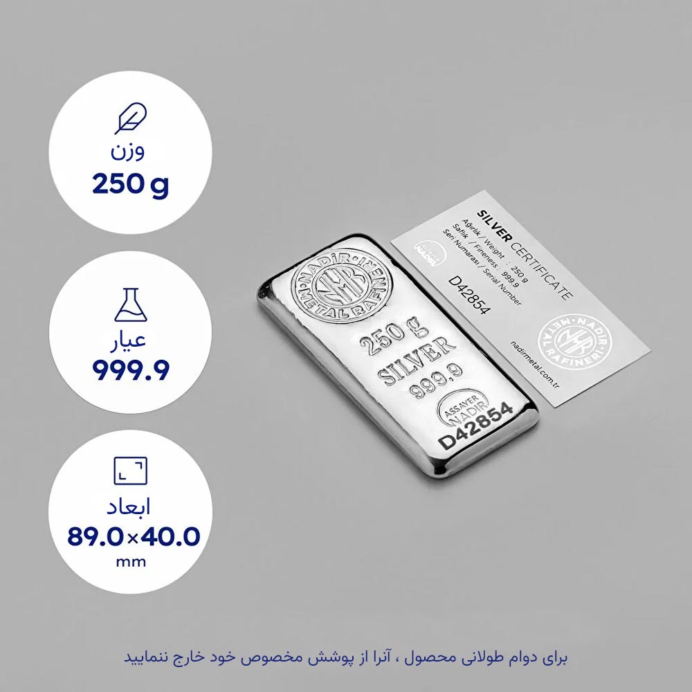 شمش نقره ۲۵۰ گرمی نادیر گلد تولید شرکت معتبر Nadir Metal Rafineri ترکیه است که با خلوص بالای 999.9 (99.99%) عرضه میشود. این شمشها به دلیل وزن مناسب، اصالت بالا و بستهبندی حرفهای، یکی از گزینههای ایدهآل برای سرمایهگذاران خرد و کلکسیونداران نقره محسوب میشوند.